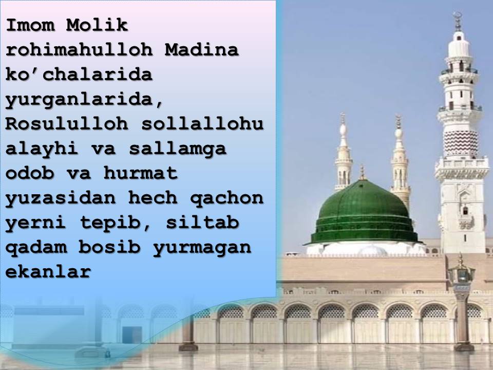 Alloh taolo Imom Molik ibn Anasni rahmat aylasin, Islom va musulmonlar uchun qilgan mehnatlarining savobini ko’paytirib bersin.