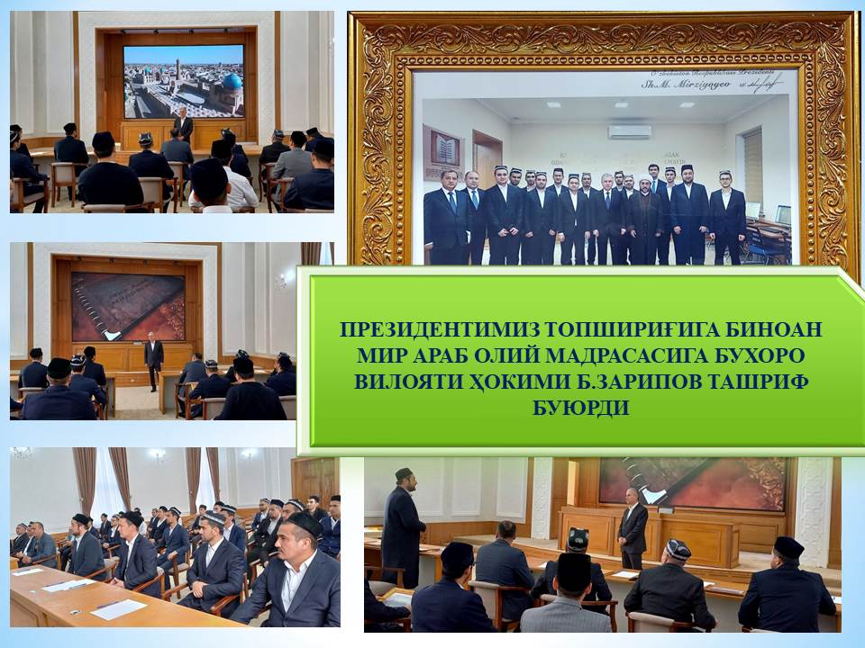 Kuni kecha Davlatimiz Rahbarining Mir Arab oliy madrasasiga tashrifi boʻlib oʻtgan edi. Bugun Buxoro viloyat hokimi Botir Zaripov Mir Arab oliy madrasasiga tashrif buyurib, Oliy madrasaning yangi binosi toʻliq foydalanishga topshirilgani bilan barchani tabrikladi.