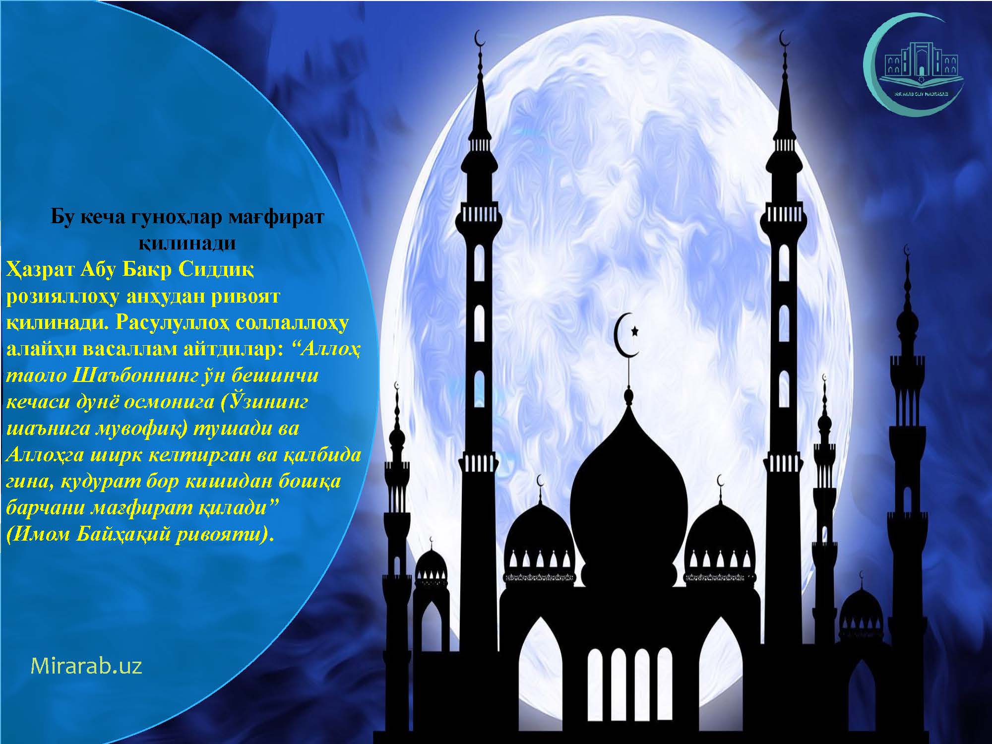Rasululloh sollallohu alayhi vasallam aytdilar: Jabroil alayhissalom mening oldimga kelib: “Bu Shaʼbonning oʻn beshinchi kechasidir. Alloh taolo bu kechada koʻp odamlarni doʻzaxdan ozod qiladi. Ularning adadi Kalb qabilasi qoʻylarining junlaridan ham ziyoda boʻladi. Faqat bu kechada Alloh taologa shirk keltirgan, ginachi va qarindoshlik aloqalarini uzuvchi, izorini (manmanlik bilan) toʻpigʻidan pastga tushirib yuruvchi, ota-onasiga oq boʻluvchi va xamr ichuvchi kishilarga rahmat nazari bilan qaramaydi”, dedilar (Imom Bayhaqiy rivoyati).