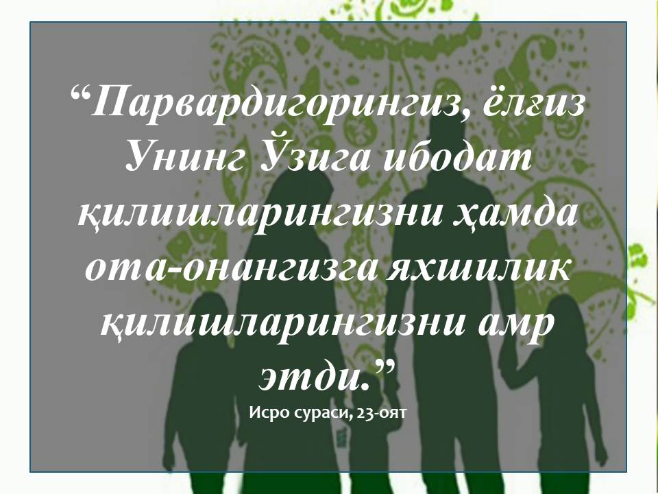 Barchamizning dunyoga kelishimizga sababchi boʻlgan zotlar bor. Bu dunyoda atrofimizdagilardan koʻra mehribonroq, haqiqatni roʻy-rost aytadigan doʻst, yaxshi kunimizda biz bilan birga quvnaydigan, yomon kunlarda bizdan ham ziyodroq tashvishlanadigan bular bizlarning ota-onalarimizdirlar.