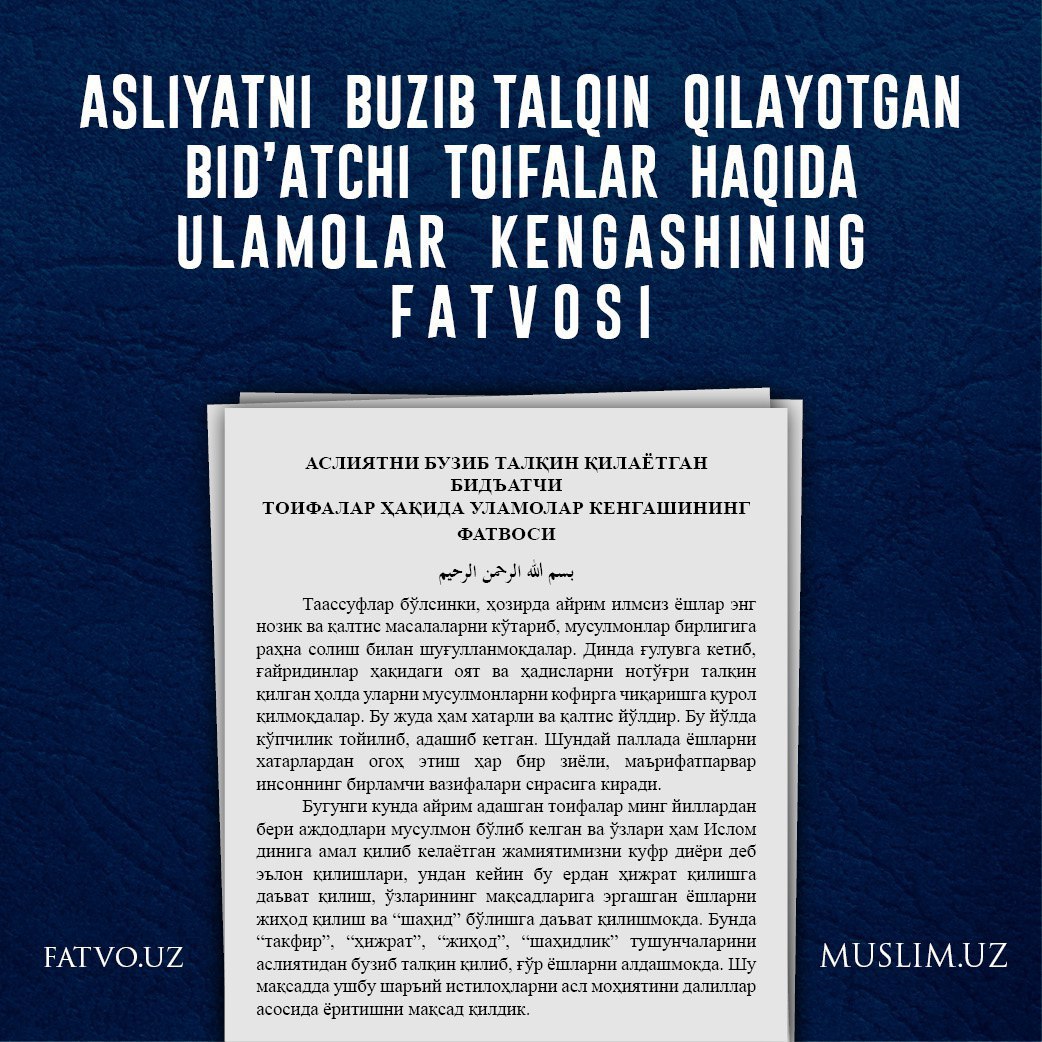 Юқоридагилардан келиб чиқиб, Ўзбекистон мусулмонлари идораси уламолар Кенгаши қуйидагиларни маълум қилади:
