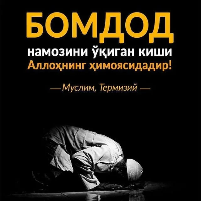 6.Ким бомдод намозини ўз вақтида ўқиса, мунофиқликдан узоқ бўлади. Расулуллоҳ соллаллоҳу алайҳи васаллам: “Мунофиқларга энг оғир намоз хуфтон ва бомдод намозларидир”, деганлар.