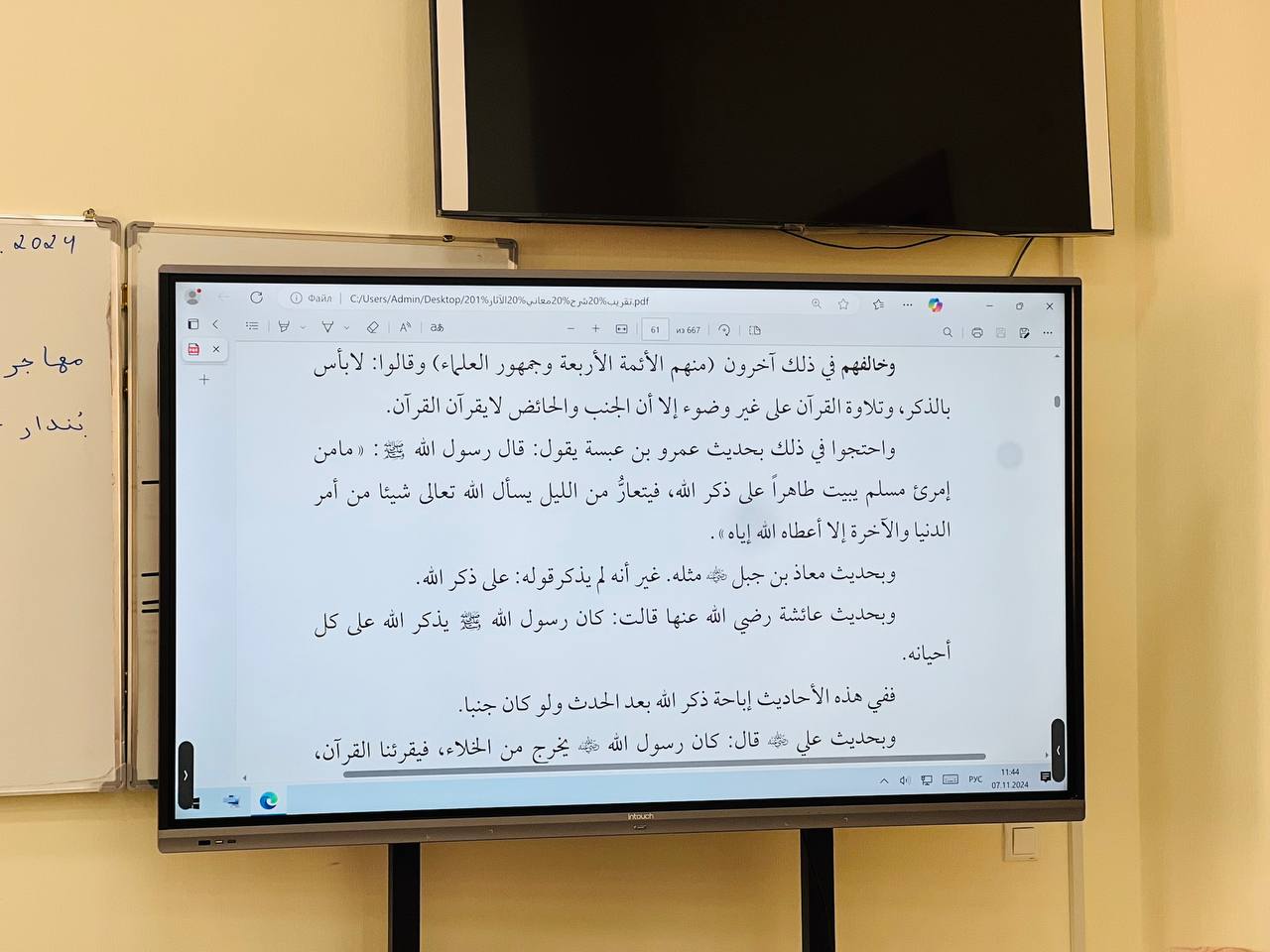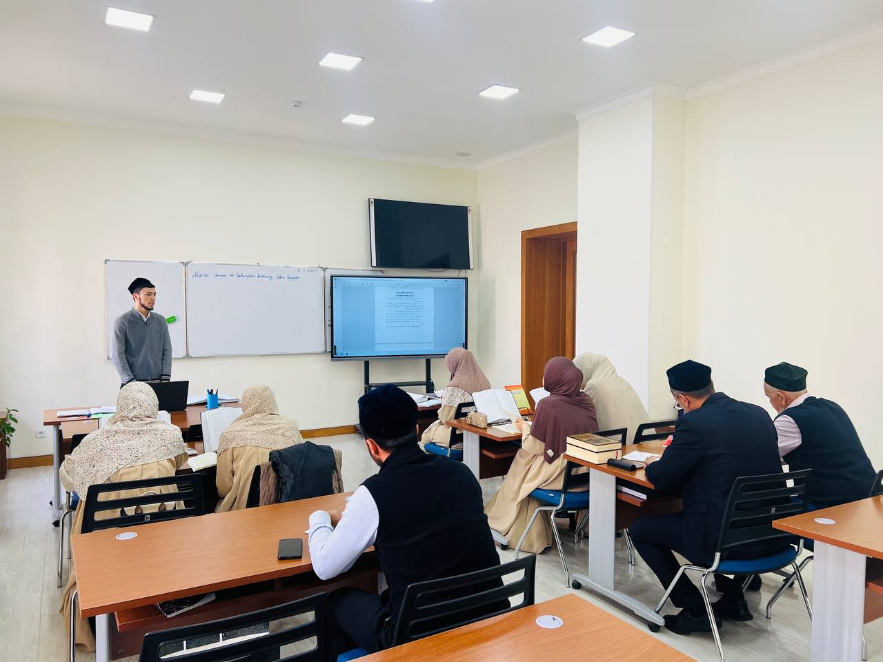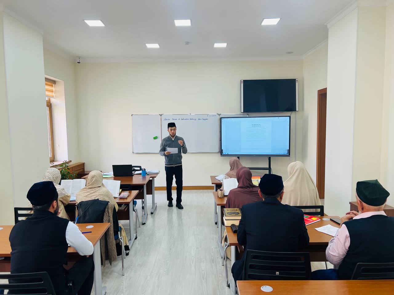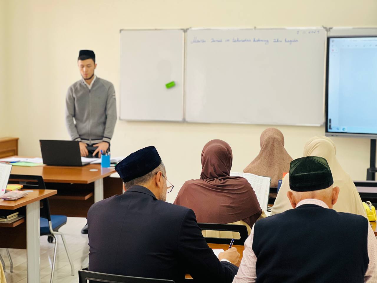 Мир Араб олий мадрасаси “Диний фанлар ва тиллар” кафедраси ўқитувчиси Азимжон Якубов 103-24 гуруҳ талабаларига Ҳадис фанидан “Маҳсига масҳ тортиш ҳукми ҳақида” мавзусида очиқ дарс ўтди.