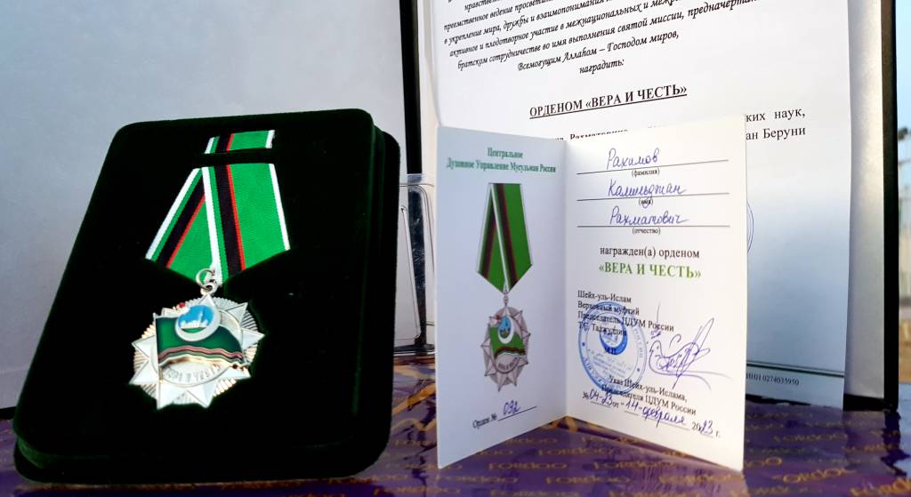 Rossiya musulmonlari Markaziy diniy idorasi rayosatining 2023-yil 14-fevraldagi qarori va Rossiya markaziy diniy idorasi raisi, Bosh muftiy, shayxulislom Talʼat Safo Tojiddinning shu sanadagi №04-23-sonli farmoniga asosan, Oʻzbekiston Fanlar akademiyasi Abu Rayhon Beruniy nomidagi Sharqshunoslik instituti yetakchi ilmiy xodimi, “Naqshbandiya” jurnalining bosh muharriri oʻrinbosari, tarix fanlari doktori, sharqshunos, manbashunos, bitikshunos, islomshunos, tasavvufshunos Komiljon Rahimov butun postsovet makonida diniy-axloqiy qadriyatlarni izchil oʻrnatishdagi munosib hissasi, diniy-axloqiy uygʻonishni rivojlantirishdagi roli, Rossiya va Oʻzbekiston xalqlari oʻrtasidagi tinchlik, doʻstlik va oʻzaro tushunishni mustahkamlashdagi salmoqli hissasi va boshqa xizmatlari uchun mazkur idoraning “Vera i chest” ordeni bilan taqdirlandi.