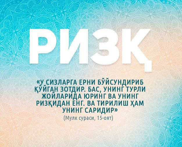“U (Alloh) sizlar uchun Yerni xokisor – boʻysunuvchi qilib qoʻygan Zotdir. Bas, sizlar u (Yer)ning har tomonida yuringlar va U (Alloh)ning rizq-roʻzidan yenglar! Yolgʻiz Uning huzuriga qaytish bordir” (Mulk, 15).
