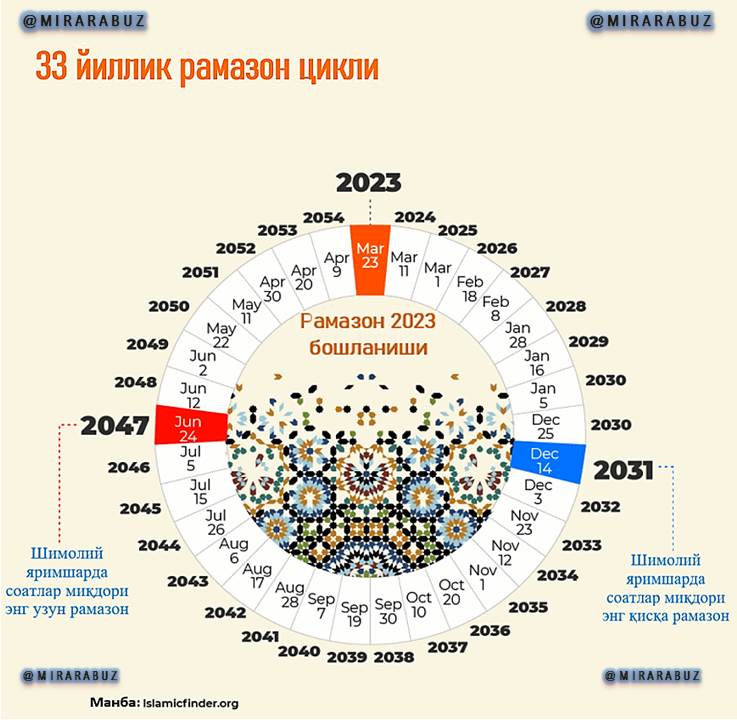 Кейинги сафар Рамазон ойининг 23 мартдан кейин бошланиши 33 йилдан сўнг - 2056 йилда бўлади.