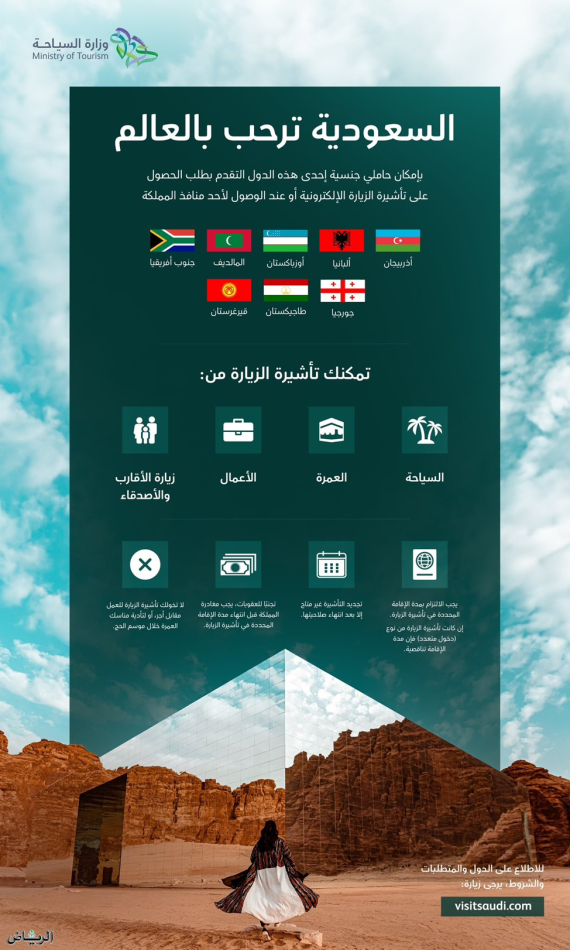 Мамлакат Туризм вазирлиги саккизта янги давлатга: Озарбайжон, Aлбания, Ўзбекистон, Жанубий Aфрика, Грузия, Тожикистон, Қирғизистон ва Малдив оролларига “электрон низом” асосида зиёрат визаси бериш бўйича янги қадам ташлади. Мазкур давлат фуқаролари қиролликдаги халқаро портлардан бирига етиб келган вақтда Қиролликка электрон шаклдаги зиёрат визаси учун талабнома билан мурожаат этишлари мумкин бўлади.
