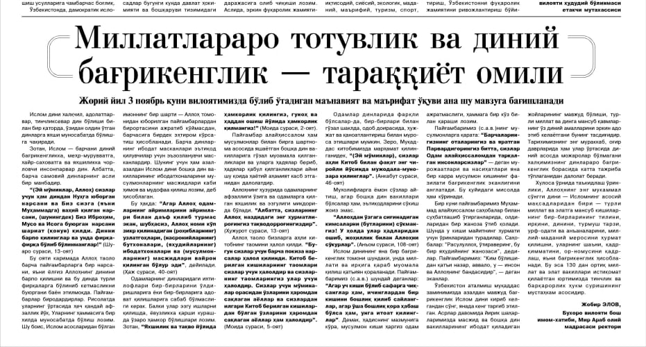 Бизнинг, Ўзбекистон аталмиш муқаддас заминимизда азалдан мавжуд бағрикенглик ислом дини кириб келгандан сўнг янада кенг тарғиб этилган. Асрлар давомида йирик шаҳарларимизда масжид ва бошқа дин вакилларининг ибодат қиладиган жойларининг мавжуд бўлиши, турли миллат ва динга мансуб қавмларнинг ўз диний амалларини эркин адо этиб келаётгани бунинг тасдиғидир. Тарихимизнинг энг мураккаб, оғир даврларида ҳам улар ўртасида диний асосда можаролар бўлмагани халқимизнинг динлараро бағрикенглик борасида катта тажриба тўплаганидан далолат беради.