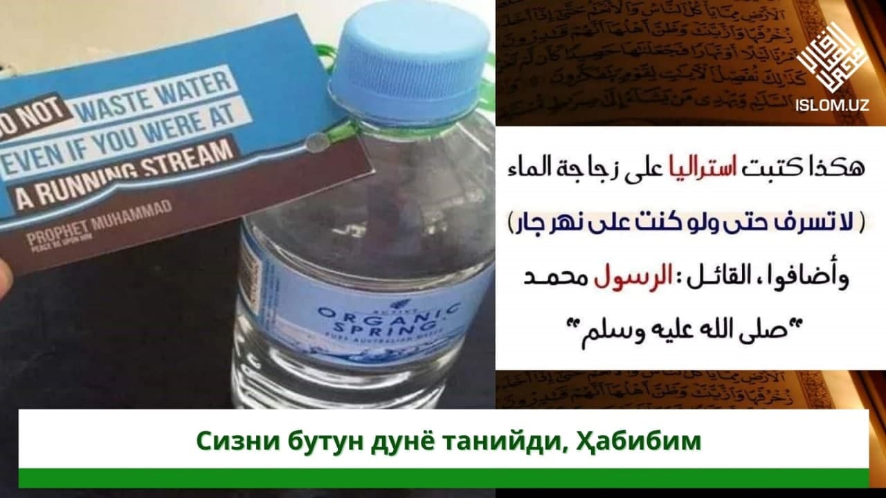 Австралияда қадоқланадиган ушбу маҳсулот этикеткасига «Оқиб турган дарё бўйида бўлсанг ҳам, сувни исроф қилма!», деб ёзиб қўйилган. Унинг остига «Муҳаммад соллаллоҳу алайҳи васаллам» дейилган.
