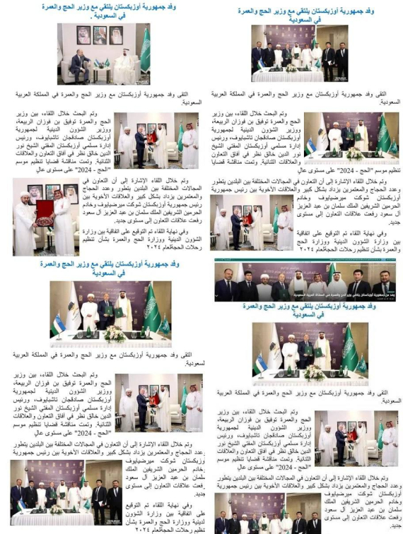 «Мулоқот чоғида томонлар Саудия Арабистони ва Ўзбекистон ўртасидаги ҳамкорлик истиқболлари ҳамда «Ҳаж–2024» мавсумини юқори даражада ташкил этиш масалаларини муҳокама қилдилар, - дейилади мақолаларда.