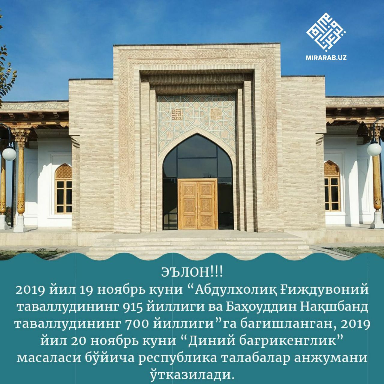 Баҳоуддин Нақшбанд ёдгорлик мажмуаси марказининг конференция залида 2019 йил 19 ноябрь куни “Абдулхолиқ Ғиждувоний таваллудининг 915 йиллиги ва Баҳоуддин Нақшбанд таваллудининг 700 йиллиги”га бағишланган, 2019 йил