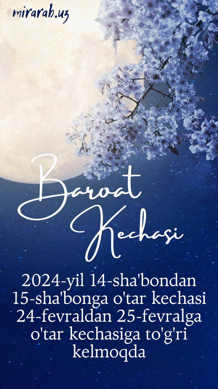 ЭСЛАТМА! ШАЪБОН ОЙИНИНГ 14-ДАН 15-ГА ЎТАР КЕЧАСИ ЭНГ ФАЗИЛАТЛИ ТУНЛАРДАН БИРИ БАРОАТ КЕЧАСИДИР. (МИЛОДИЙ ҲИСОБДА 2024 ЙИЛ 24 ФЕВРАЛДАН 25 ФЕВРАЛГА ЎТАР КЕЧАСИГА ТЎҒРИ КЕЛАДИ ИНШААЛЛОҲ).