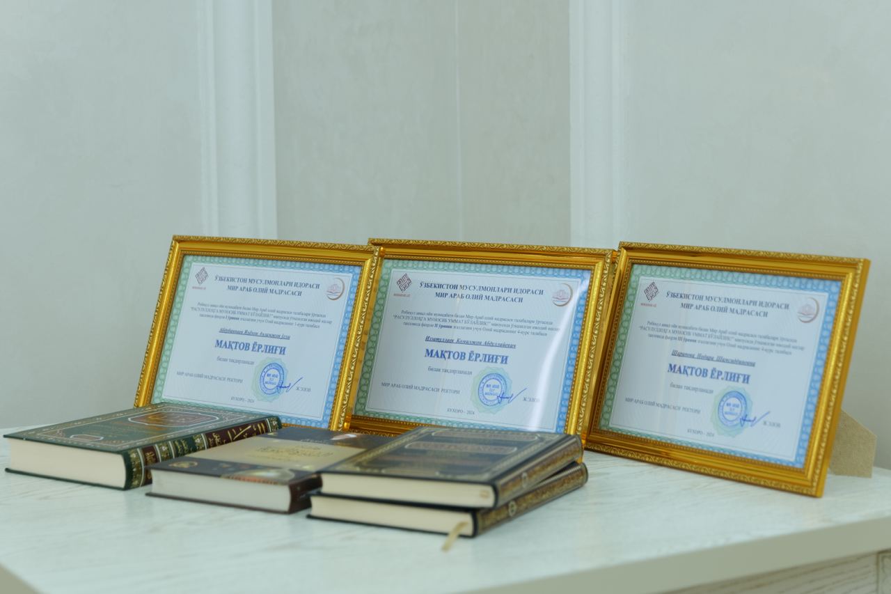 Танловда ўрин эгаллаган талабларга Олий мадраса раҳбарияти томонидан мақтов ёрлиғилари ҳамда эсдалик совғалари топширилди.