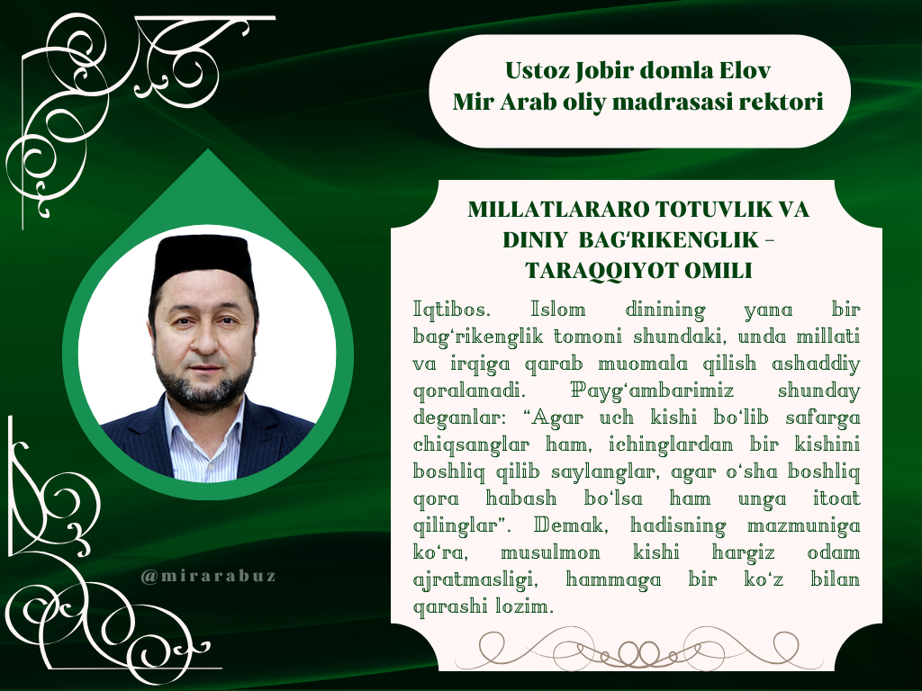Ислом барча инсонларни диний бағрикенгликка, меҳр-мурувватга, хайр-саховатга ва яхшиликка чорловчи инсонпарвар дин. Албатта, барча самовий динларнинг асли бир манбадир.