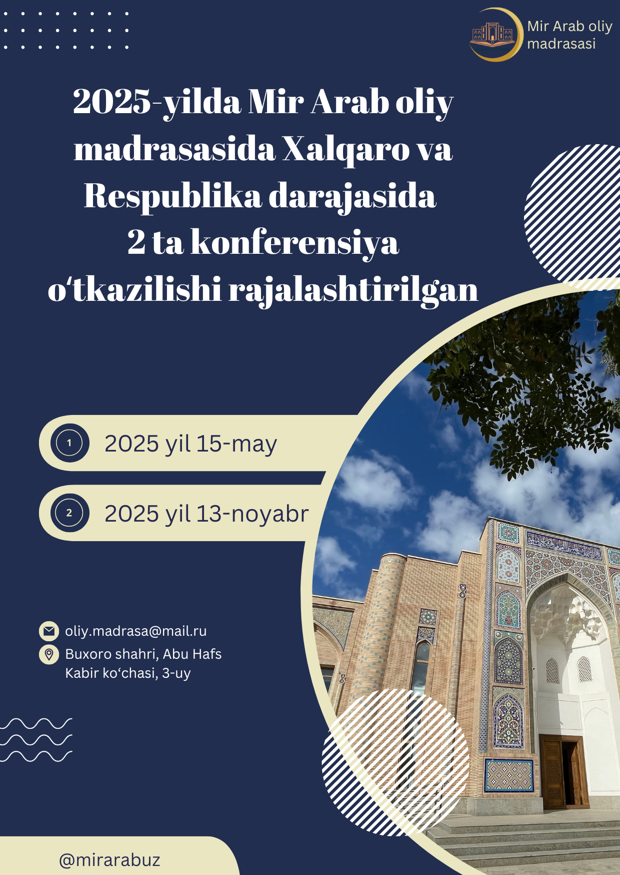 Жорий йилнинг 15 май санасида “Ислом маърифати — ахлоқий ва маънавий баркамоллик асоси” мавзусида республика даражасида ва 13 ноябрь санасида “Глобаллашув даврида соф ақида ва тасаввуф масалалари” мавзусида халқаро даражадаги конференция Мир Араб олий мадрасасида ўтказилади.