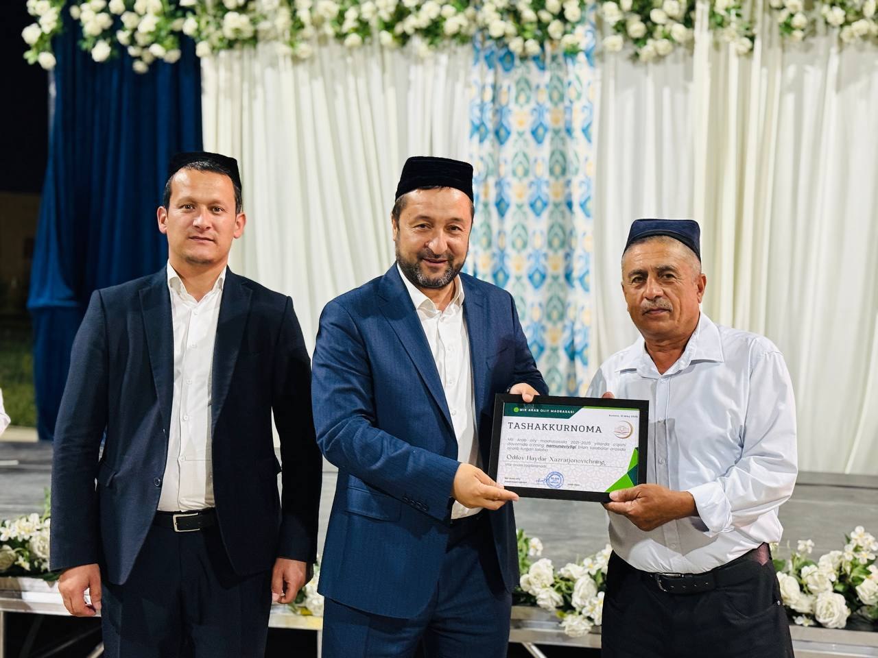 Тадбир давомида устоз Жобир домла Элов ҳамда Ўқув ишлари бўйича проректор Учқун домла Авлиёқулов томонидан барча битирувчиларнинг ота-оналарига ташаккурномалар топширилди.