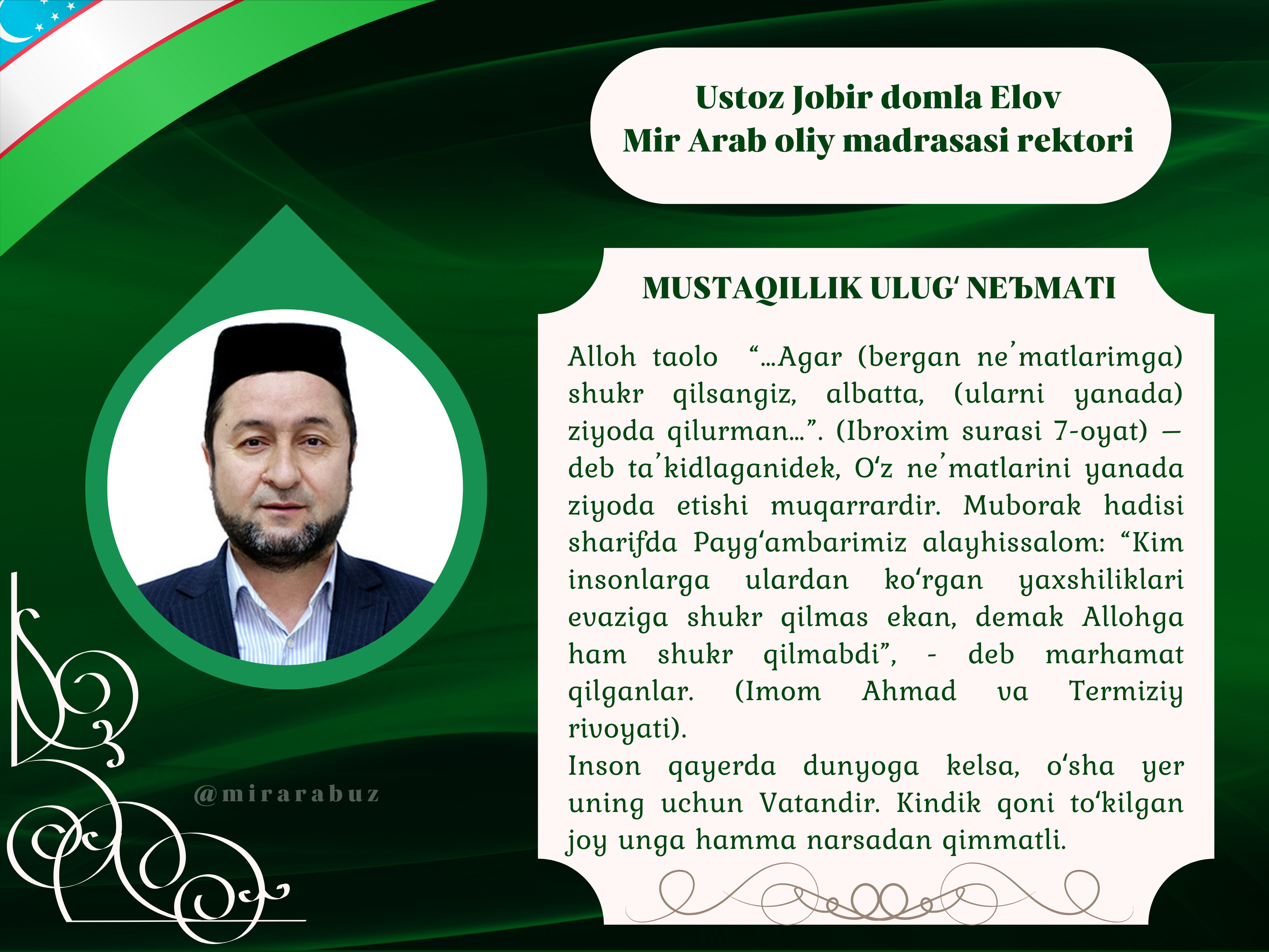 Мустақиллик, Аллоҳ таолонинг бизга ато этган энг улуғ неъматидир. Неъмат бўлганда ҳам, ҳар куни, ҳар соат фикр юритиладиган, ҳар дам шукур қилинадиган қадри-шарафи, бардавомлиги кўз қорачиғидай асраб- авайланадиган бебаҳо неъматдир.
