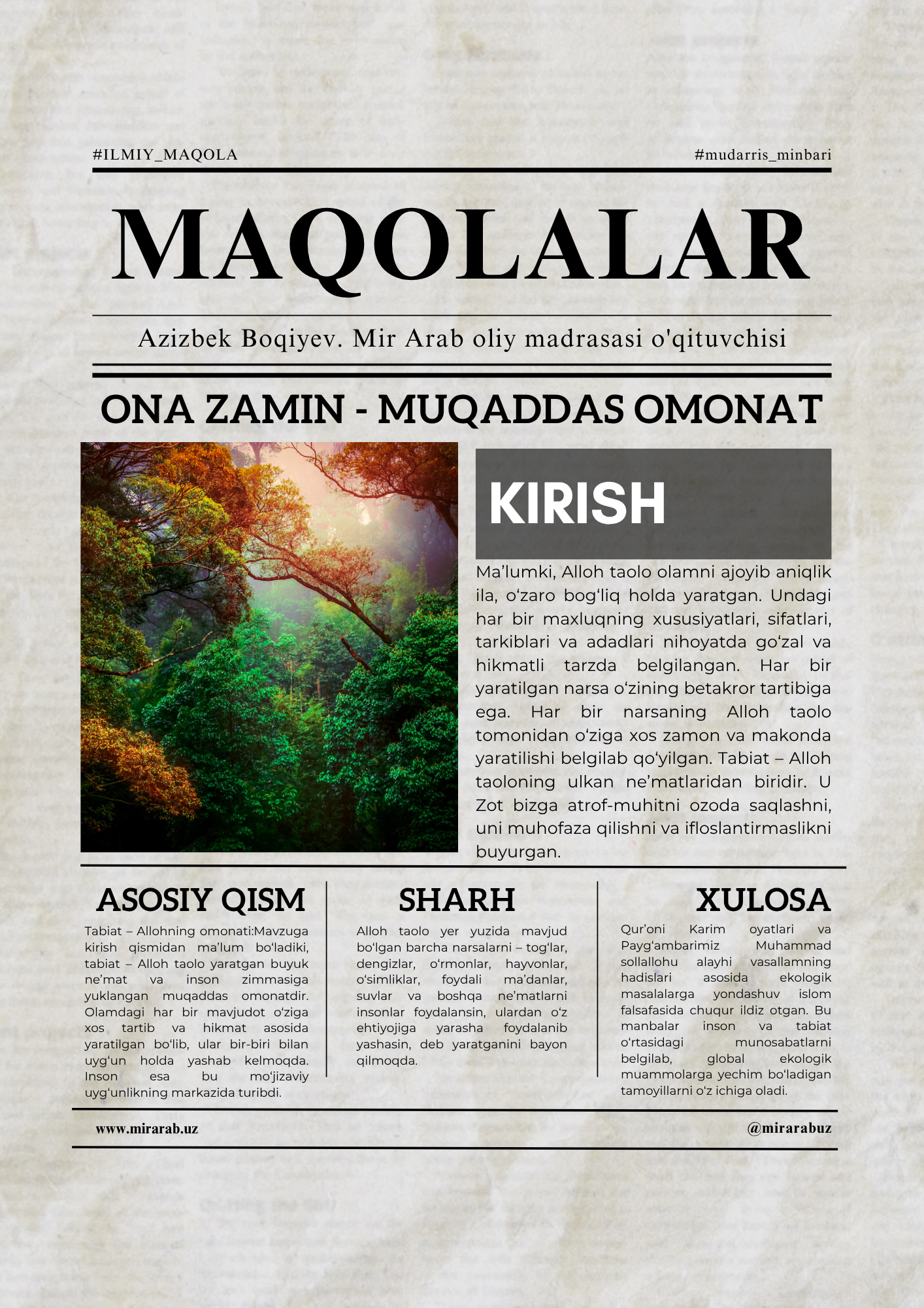 Asosiy qism: Tabiat – Allohning omonati:Mavzuga kirish qismidan ma’lum bo‘ladiki, tabiat – Alloh taolo yaratgan buyuk ne’mat va inson zimmasiga yuklangan muqaddas omonatdir. Olamdagi har bir mavjudot o‘ziga xos tartib va hikmat asosida yaratilgan bo‘lib, ular bir-biri bilan uyg‘un holda yashab kelmoqda. Inson esa bu mo‘jizaviy uyg‘unlikning markazida turibdi. Alloh taolo insoniyatga bu ne’matlarni faqatgina foydalanish uchun emas, balki ularni asrab-avaylab, pok saqlash, obod qilish vazifasini ham yukladi. Shu bois, atrof-muhitni muhofaza qilish masalasi faqat zamonaviy dunyoning ilmiy yoki texnik muammosi emas, balki u qadimdan ilohiy manbalarda o‘z ifodasini topgan. Islom dini tabiatni asrashga doir qator buyruq va ko‘rsatmalar bilan boy. Qur’oni karim oyatlari va Rasululloh sollallohu alayhi vasallamning hadislarida inson va tabiat o‘rtasidagi munosabat aniq belgilab qo‘yilgan. Shu o‘rinda Qur’oni karimning quyidagi oyatini eslatib o‘tish o‘rinlidir: