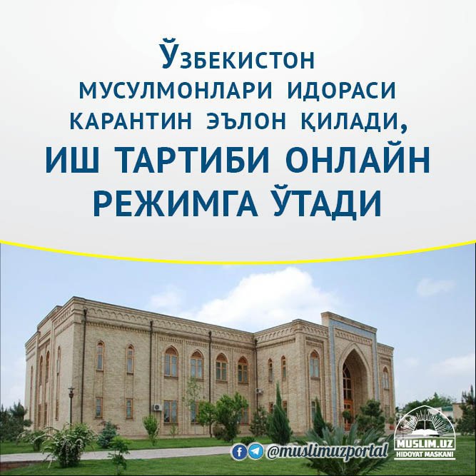 Пандемия натижасида эълон қилинган Карантин жараёнида Ўзбекистон мусулмонлари идораси ҳам карантин эълон қилади, иш тартиби онлайн режимга ўтади ва аҳолининг мурожаатларини онлайн шаклда қабул қилади ва белгиланган тартибда жавоб қайтаради.