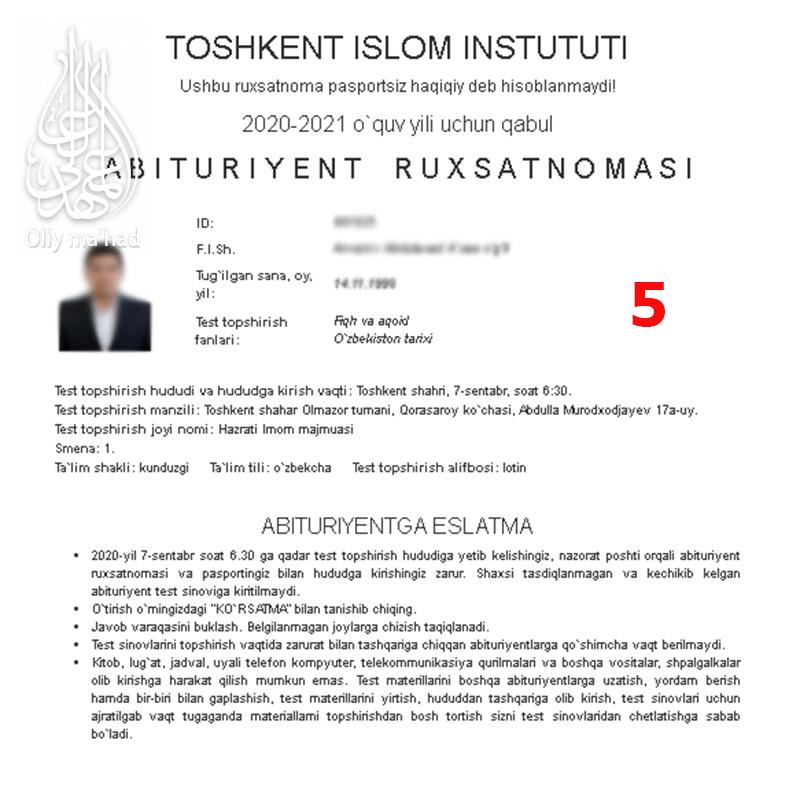 Эслатиб ўтамиз, абитуриентлар рухсатномада кўрсатилган сана ва вақтда тест топшириладиган ҳудудда бўлишлари лозим.