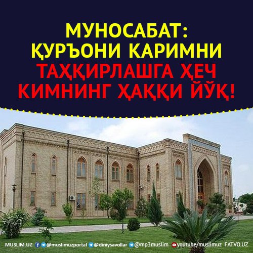 Шу ўринда, Ўзбекистон мусулмонлари идораси Қуръони каримни оёқ ости қилиш ҳолатини қаттиқ қоралашини ҳамда бу ноинсоний ҳаракат ҳеч қайси диний таълимотга ҳам, ақлга ҳам, умуман олганда, инсонийлик тамойилига ҳам тўғри келмаслигини билдиради.
