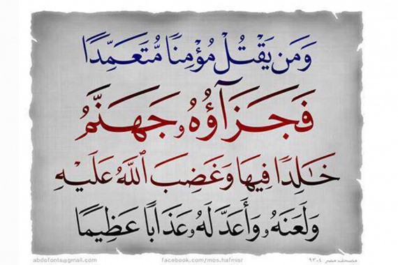 “Ким бир мўминни қасддан ўлдирса, унинг жазоси жаҳаннамдир. Унда абадий қолур. Унга Аллоҳнинг ғазаби ва лаънати ёғилур. Ва Аллоҳ унга улкан азобни тайёрлагандир” (Нисо сураси, 93-оят).