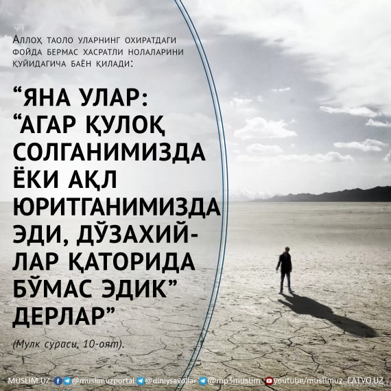 “Яна улар: “Агар қулоқ солганимизда ёки ақл юритганимизда эди, дўзахийлар қаторида бўмас эдик” дерлар” (Мулк сураси, 10-оят).