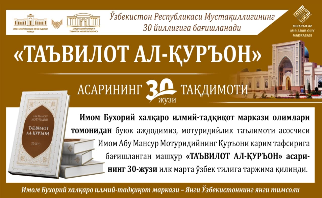 Имом Бухорий халқаро илмий-тадқиқот маркази жамоаси томонидан олиб борилган изланишлар натижаси ўлароқ, бугун ўзбек тилидаги “Таъвилот