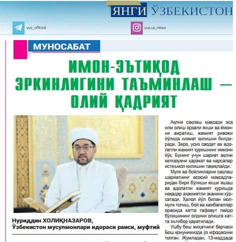 Аллоҳ таолога беҳисоб шукрки, янги Ўзбекистонда қабул қилинаётган қонун ва қонуностиҳужжатларда инсоннинг эътиқод эркинлиги, қадр-қимматини ҳурмат қилиш ҳамда унинг ҳуқуқ ва эркинликларини таъминлаш яққол ўз ифодасини топмоқда.