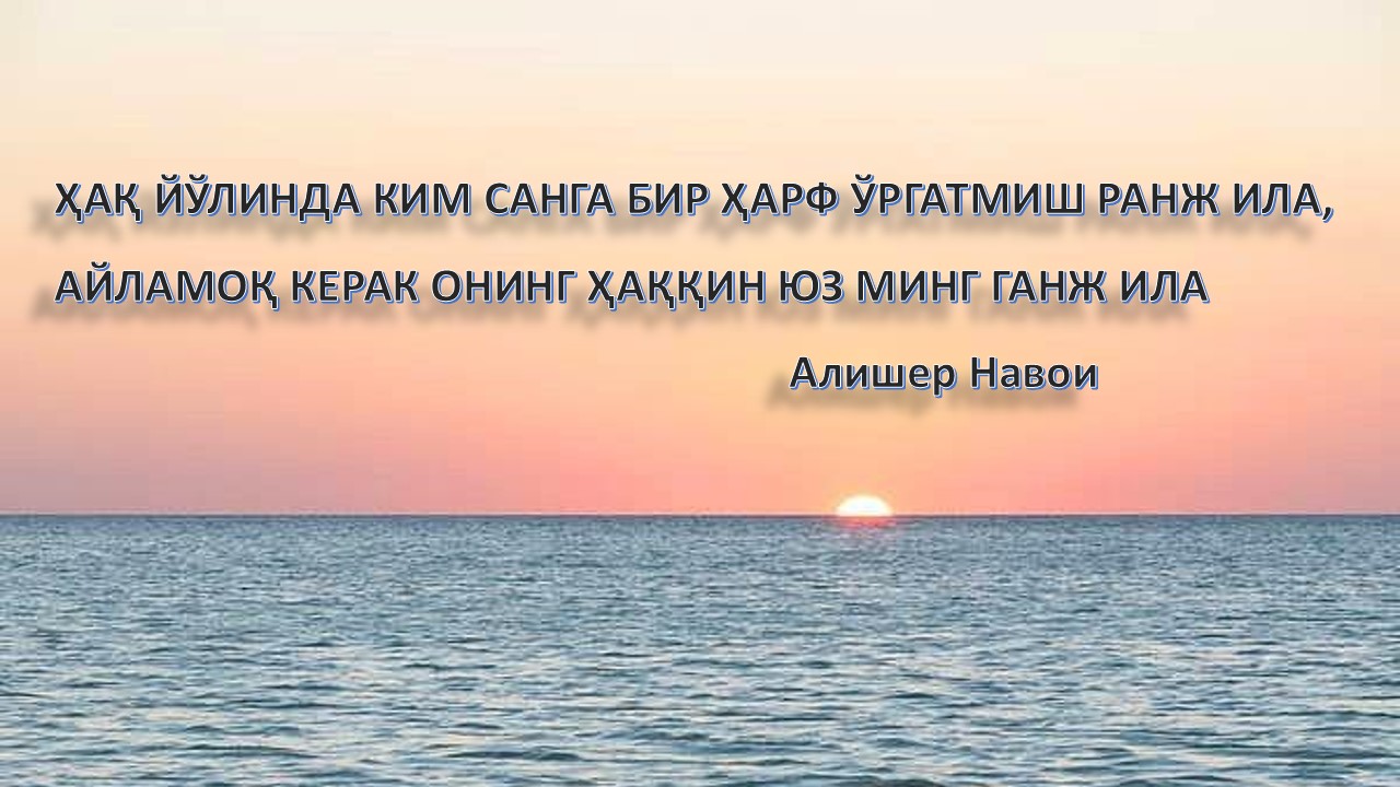 Мана шунинг ўзи ҳам диёримизда устозларга катта-ю кичик ўқитувчи ва мураббийларга бўлган ҳурмат эҳтиромнинг қанчалик юқори эканлигининг далилидир. Шу ўринда шоирнинг ушбу мисраларини ёдга олишликни лозим топдик.
