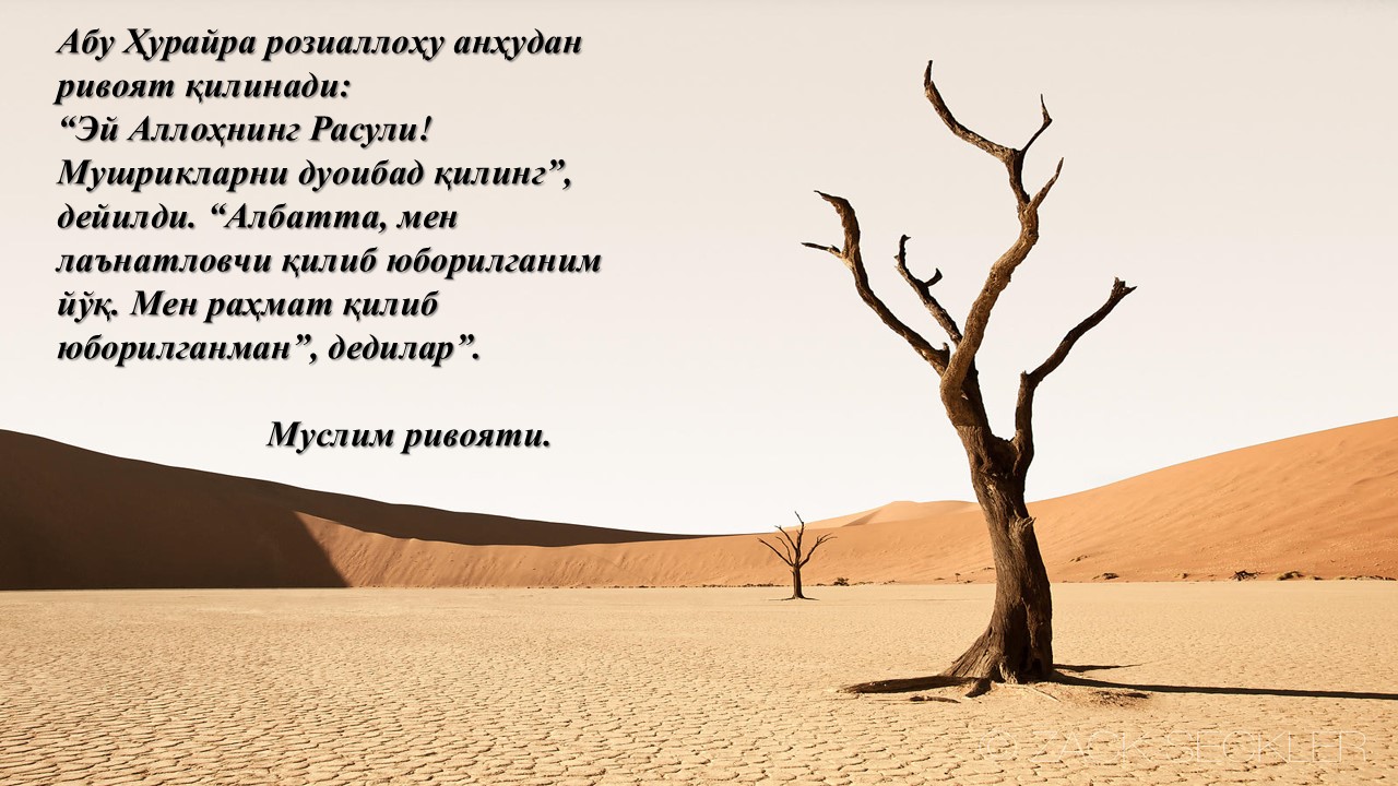 Самура ибн Жундуб розияллоҳу анҳудан ривоят қилинади: “Расулуллоҳ соллаллоҳу алайҳи васаллам: “Бир-бирларингизга Аллоҳнинг лаънати билан ҳам, Унинг ғазаби билан ҳам, дўзах билан ҳам лаънат айтманглар”, – дедилар”. Абу Довуд ва Термизий ривоят қилган.