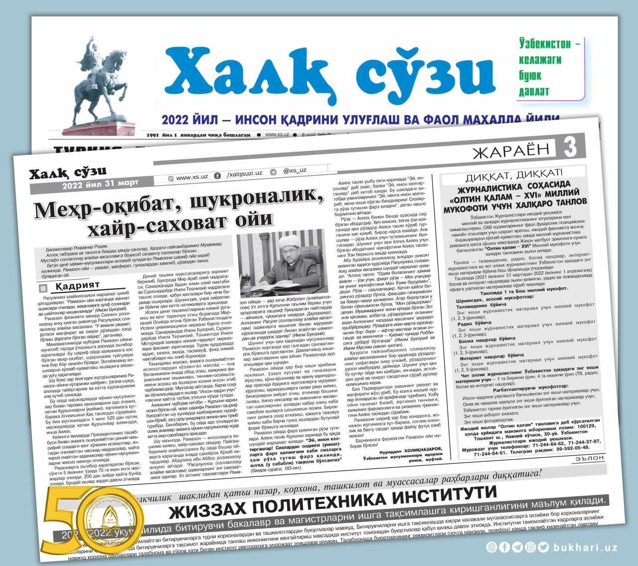 Биз Парвардигори оламнинг раҳмат ва мағфирати жўш уриб, Ер юзига илоҳий нурлар ёғиладиган ой арафасида турибмиз. Ушбу ойни ғанимат билиб, юртимиз тинчлиги, халқимиз фаровонлиги ва ризқимиз тўкинлигини Аллоҳ таолодан сўрайлик.