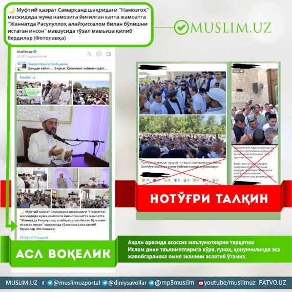 Мана шундай файзли суҳбатлардан бири шу йил 29 июль куни Самарқанд шаҳрида жойлашган "Намозгоҳ" масжидидаги жума намозига йиғилган катта жамоат билан бўлди. Ушбу жомедаги мавъизадан таъсирланган масжид қавми якунда Муфтий ҳазратларининг дуоларини олиш учун йўл ёқасига қадар тўп-тўп бўлиб, кузатиб бордилар.